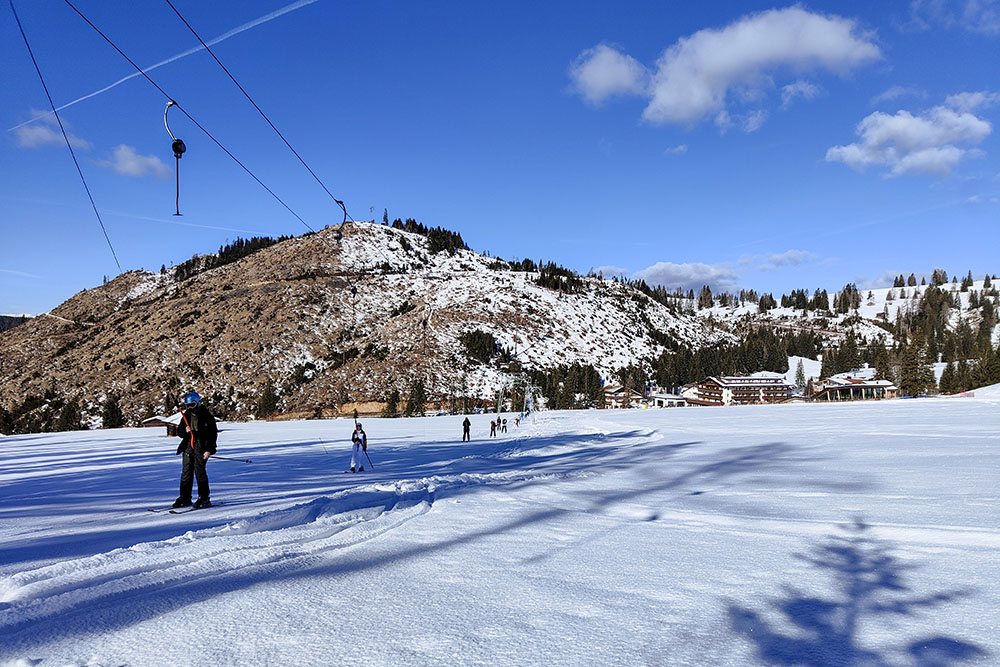 Durante la fase di ritorno, il sentiero si snoda attraverso suggestivi boschi e dolci prati, con pendenze lievi che rendono l'escursione piacevole e accessibile. Durante questa parte del percorso, il sentiero si affianca alle piste da fondo presenti nella zona, creando un'armoniosa integrazione tra la natura e le attività sportive.
