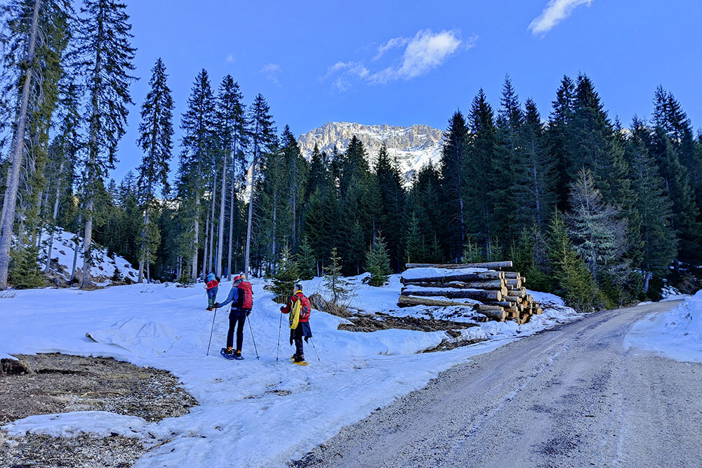 Un aspetto notevole dell'escursione è la sua esposizione quasi completa al sole. Questo non solo aggiunge un tocco di calore e luminosità all'avventura invernale, ma consente anche di godere appieno dei panorami spettacolari che si rivelano lungo il percorso. La luce del sole filtrata attraverso i rami degli alberi crea giochi di ombre sulla neve, regalando una prospettiva unica e suggestiva.