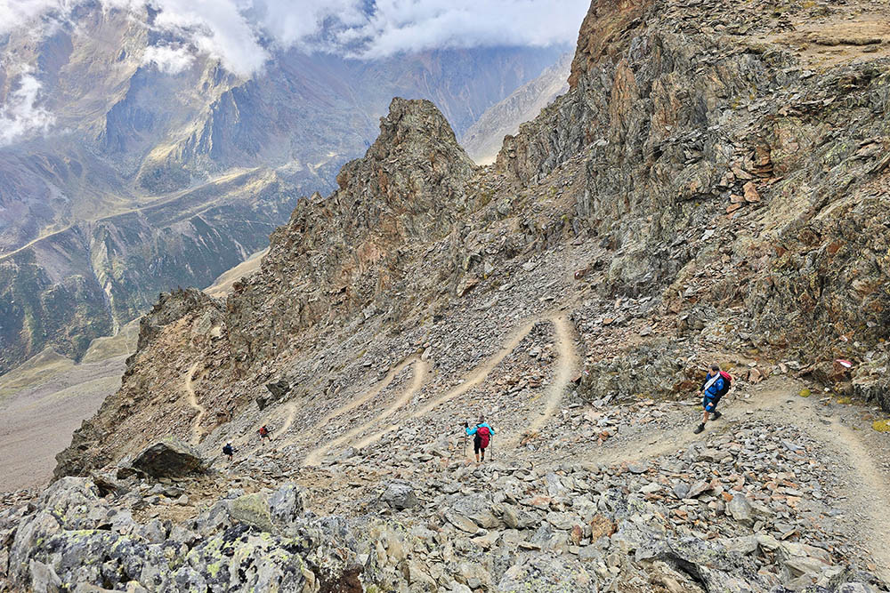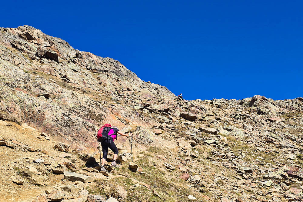L'itinerario prosegue con una salita fino al Valico Piccolo Tibet (3016 m), il punto più elevato dell'escursione. Da qui inizia la discesa lungo il sentiero n. 1, che porta al Rifugio Oberettes (2670 m). Il rientro al punto di partenza avviene seguendo sempre il medesimo segnavia n. 1, completando così questo magnifico anello di alta montagna.