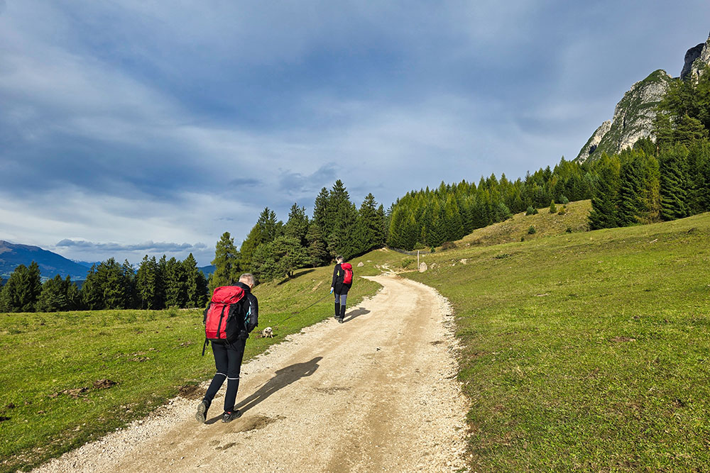 Il ritorno al punto di partenza avviene comodamente lungo la strada sterrata, seguendo prima il segnavia 1B e poi l'1, che riportano al parcheggio del laghetto attraverso un percorso in discesa.