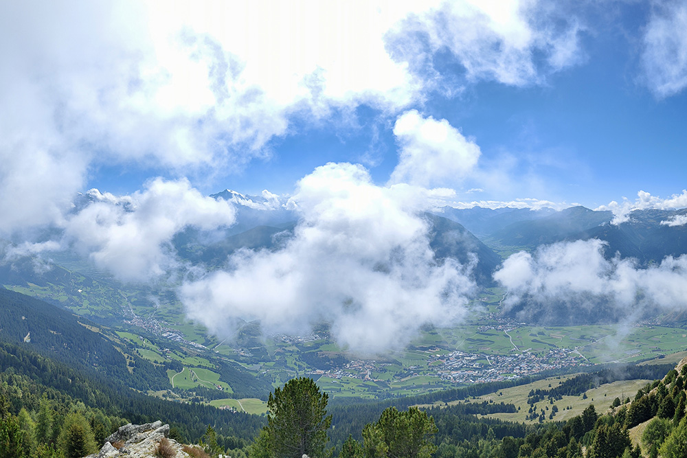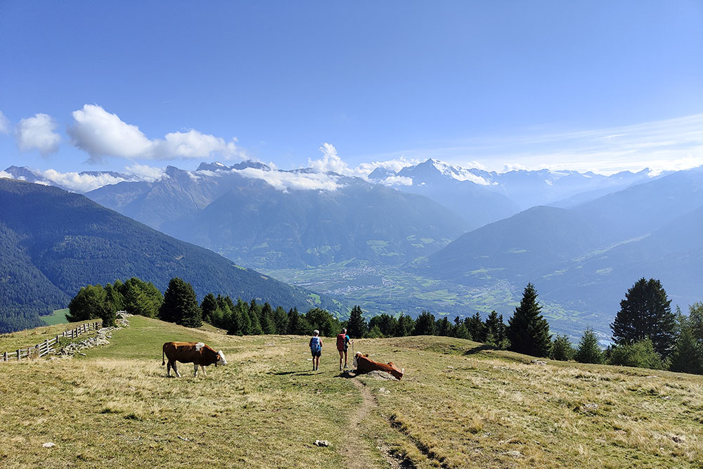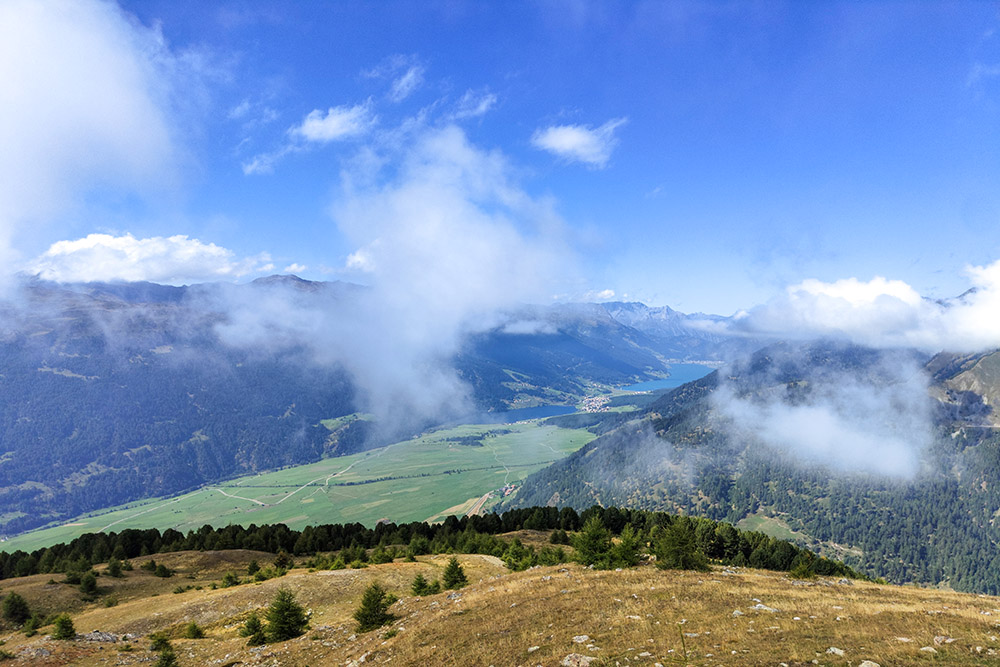 Dalla vetta del Piz Lun, si apre una vista straordinaria sul Gruppo dell’Ortles, sulle montagne svizzere e austriache, oltre che sui laghi Haidersee (Lago della Muta) e Reschensee (Lago di Resia).