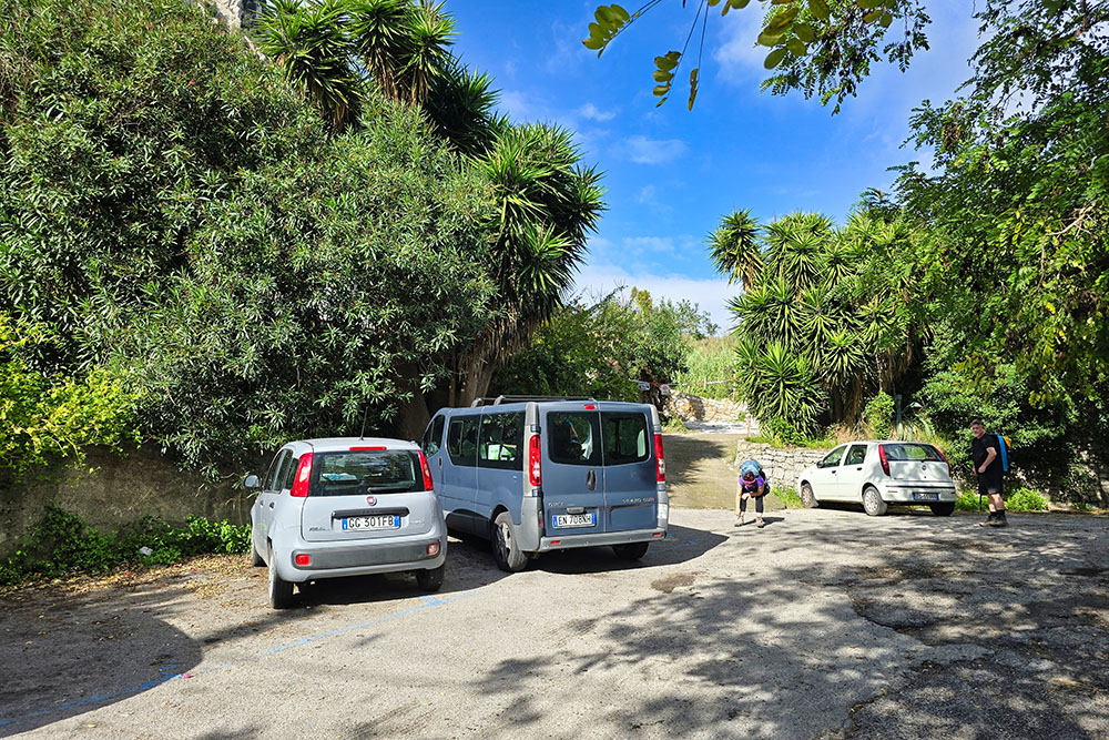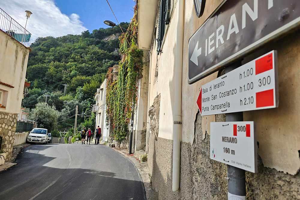 Da Nerano (170 m) si prende il sentiero CAI 300 in direzione della Baia di Ieranto. Dopo poche centinaia di metri ci si stacca dal percorso principale imboccando sulla destra un sentiero, poco visibile, che sale verso la sella occidentale del Monte San Costanzo. La prima parte attraversa un fitto bosco con una salita molto ripida; successivamente il sentiero esce allo scoperto, dove la traccia è spesso invasa dalla vegetazione e talvolta poco evidente sotto i piedi.