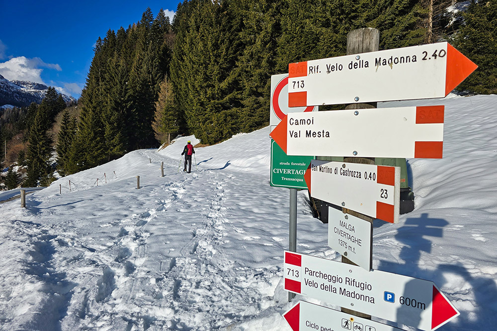 Dal rifugio forestale si continua a risalire la Val di Roda immettendosi nel sentiero 721. Al bivio per il Rifugio Velo della Madonna si abbandona il 721 e si scende, giungendo in poche centinaia di metri sulla strada forestale Sora Ronz che porta ai ruderi di Malga Sora Ronz (1580 m). Da qui, seguendo il sentiero 713, si scende a Malga Civertaghe (1375 m).