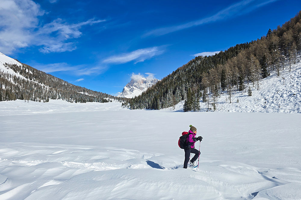 Il percorso si snoda tra radure e boschi, alternando tratti pianeggianti a salite. L’ambiente è tipicamente alpino: silenzioso in inverno, con il lago spesso ghiacciato e i prati coperti da uno spesso manto nevoso. La vista sulle Pale di San Martino accompagna gran parte dell’escursione, offrendo un costante riferimento paesaggistico.