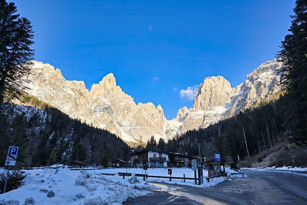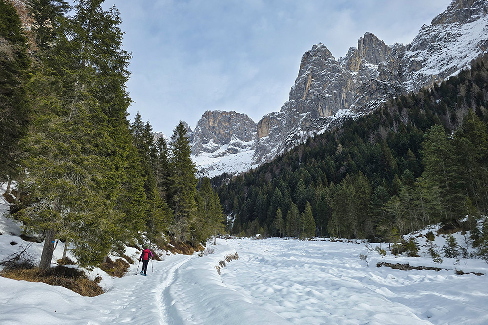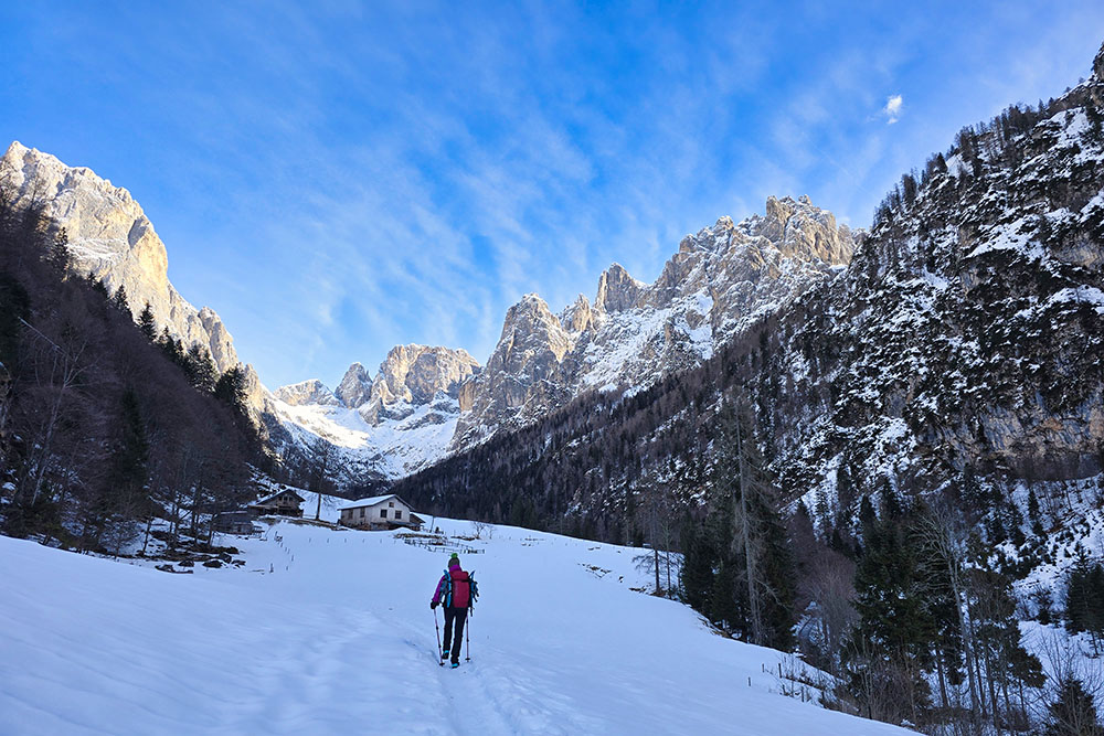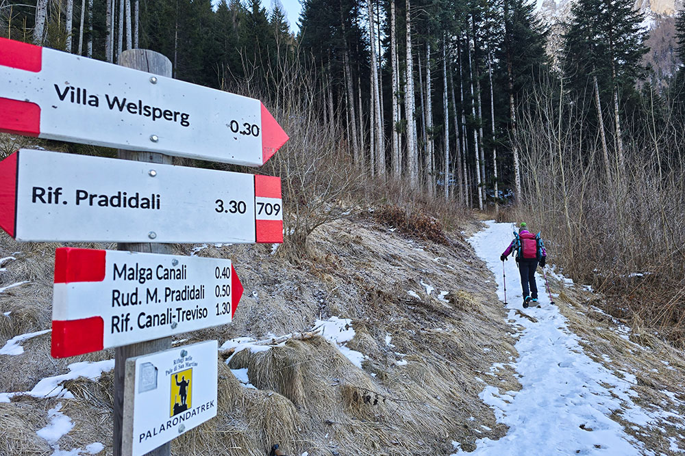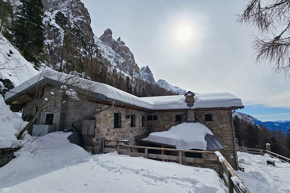 Il Rifugio Treviso in Val Canali, a quota 1.630 m, rappresenta una delle mete più classiche e gratificanti di questa valle. In estate costituisce un'ottima base d'appoggio per escursioni ed ascensioni più impegnative sulle Pale di San Martino meridionali; in inverno si trasforma in una destinazione piacevole e accessibile, percorribile con o senza ciaspole. Dal punto di vista tecnico si tratta di un'escursione facile, priva di passaggi difficili, adatta a chi dispone di un minimo di allenamento e di un'adeguata preparazione fisica. Lungo tutto il percorso si gode di un magnifico panorama sulle pareti meridionali delle Pale. Il rifugio è aperto indicativamente dall'inizio di giugno a fine settembre; il locale invernale, con 4 posti letto, rimane invece sempre accessibile. Si consiglia di verificare l'apertura effettiva contattando direttamente la struttura.